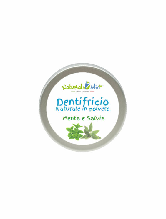 Il dentifricio in polvere NaturalMio è adatto per un'ottima igienizzazione della bocca, ha un'azione disinfettante e antibatterica. Gli ingredienti principali sono la menta e la salvia officinali, con l'aggiunta di bicarbonato di sodio micronizzato e olio essenziale di menta piperita.